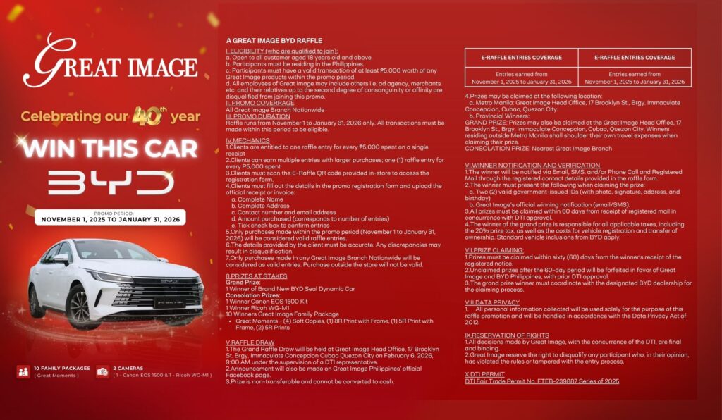 To thank you for being part of our journey, we’re giving you a chance to take HOME and WIN a brand-new BYD car. A stylish, eco-friendly ride that’s perfect for creating new adventures with your loved ones. Imagine driving home in your brand-new car, all because you chose to capture your precious moments with Great Image!